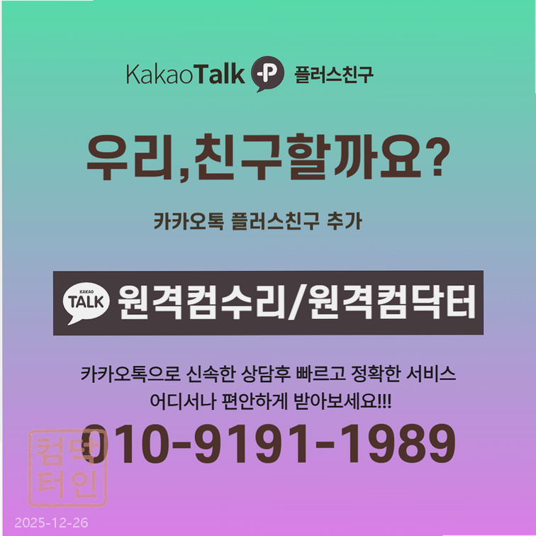 - 카카오톡 문의: 카카오채널 ‘원격컴수리’ 또는 ‘원격컴닥터’ 검색 → 1:1 채팅 접수